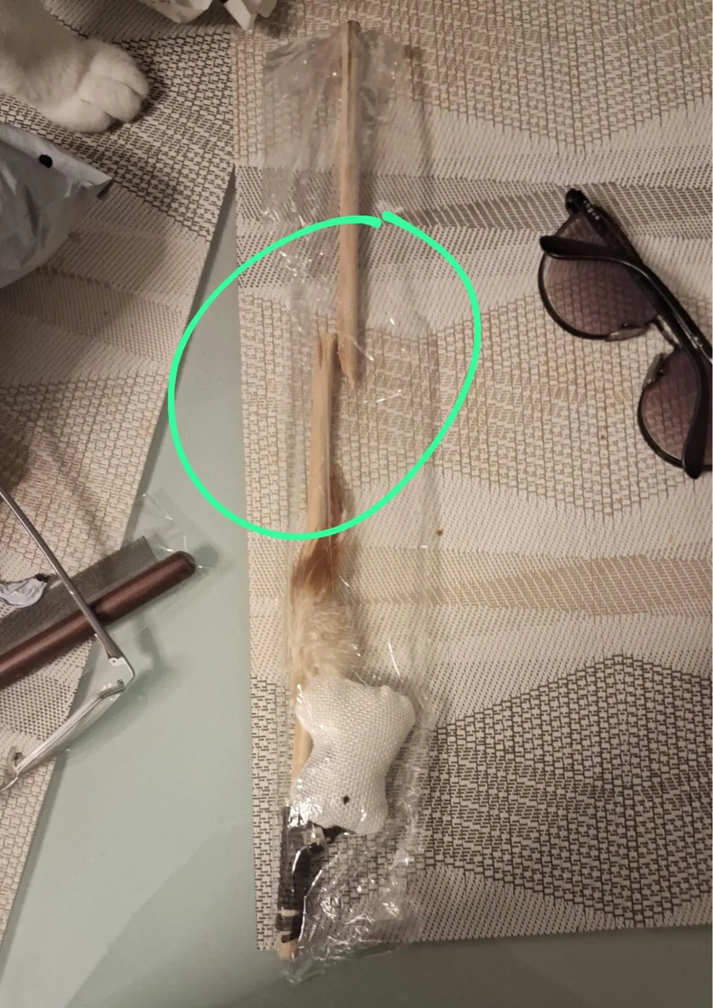 The first time the cat played with it all the feathers stayed in his mouth. Really dangerous.